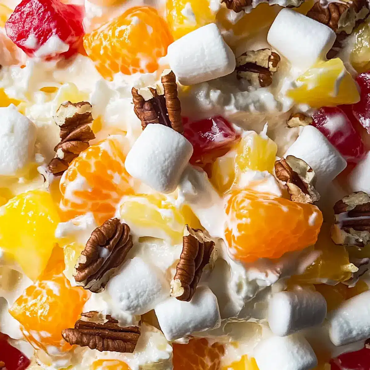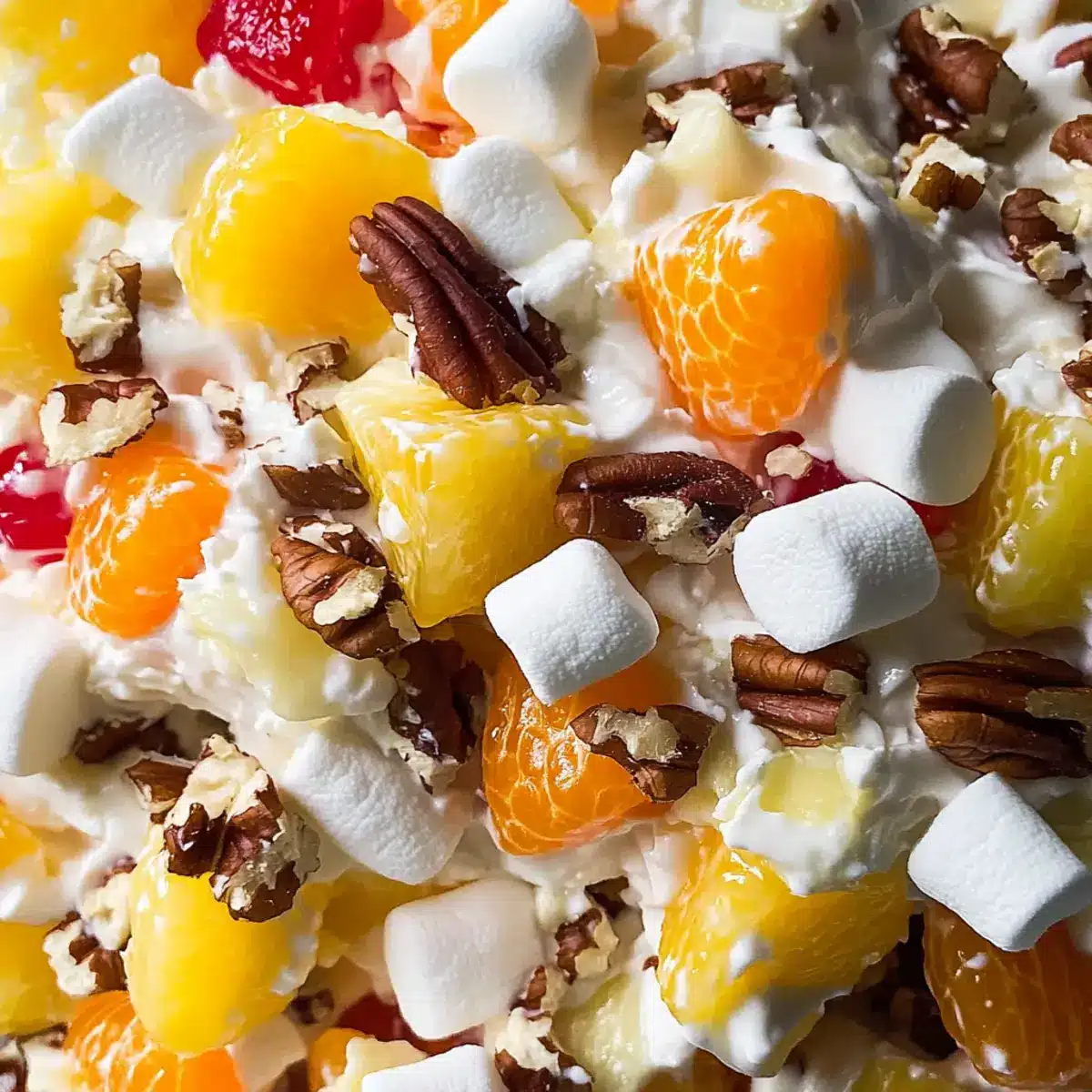 - Fold in mini marshmallows, mandarin oranges, and chopped pineapple. Add shredded coconut, maraschino cherries, and toasted pecans. Mix gently to keep fruits whole.