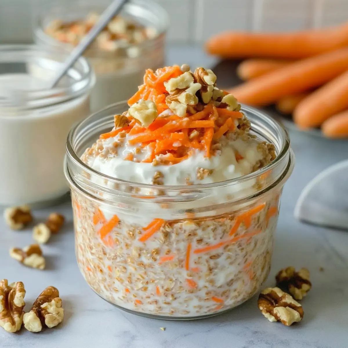 These Carrot Cake Overnight Oats are an absolute lifesaver for busy mornings! You can prepare them up to 3 days in advance, allowing you to enjoy a nutritious breakfast without the morning rush. To make ahead, simply follow the recipe instructions through Step 5, then cover and refrigerate your jars overnight, allowing them to thicken and meld in flavor. For the best quality, keep the shredded carrots and chopped walnuts integrated in the mixture but consider adding any additional toppings like fresh fruits or coconut just before serving for the best texture and taste. When you’re ready to indulge, just stir the oats, adjust the consistency if needed, and enjoy a delightful breakfast that tastes just as fresh as when you made it!