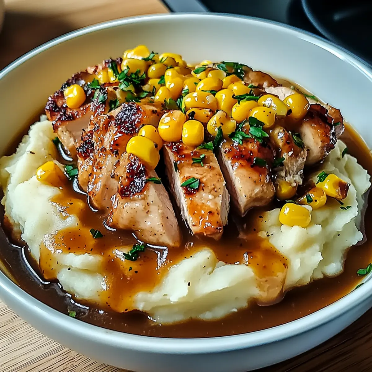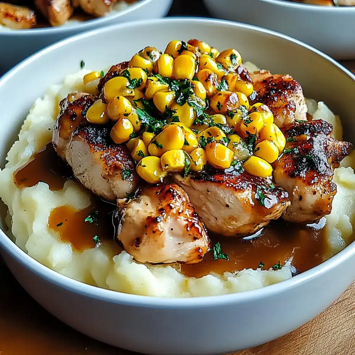 In serving bowls, start with a generous scoop of the reheated mashed potatoes as the foundation. Layer with the sweet corn and then top with the seared chicken. Finally, drizzle the warm gravy generously over everything, making sure to distribute the delicious sauce throughout your Chicken Mashed Potato Bowls.