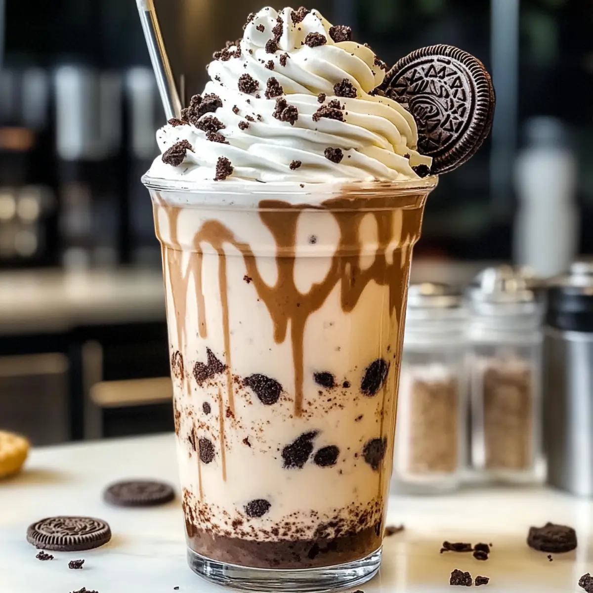- Top with a generous swirl of whipped cream and garnish with crushed or whole Oreo cookies.