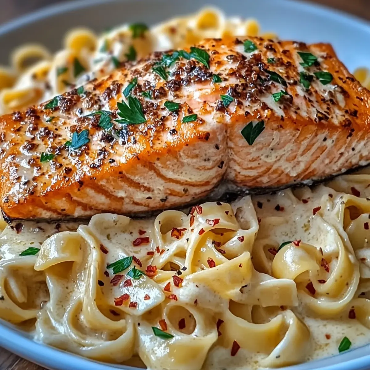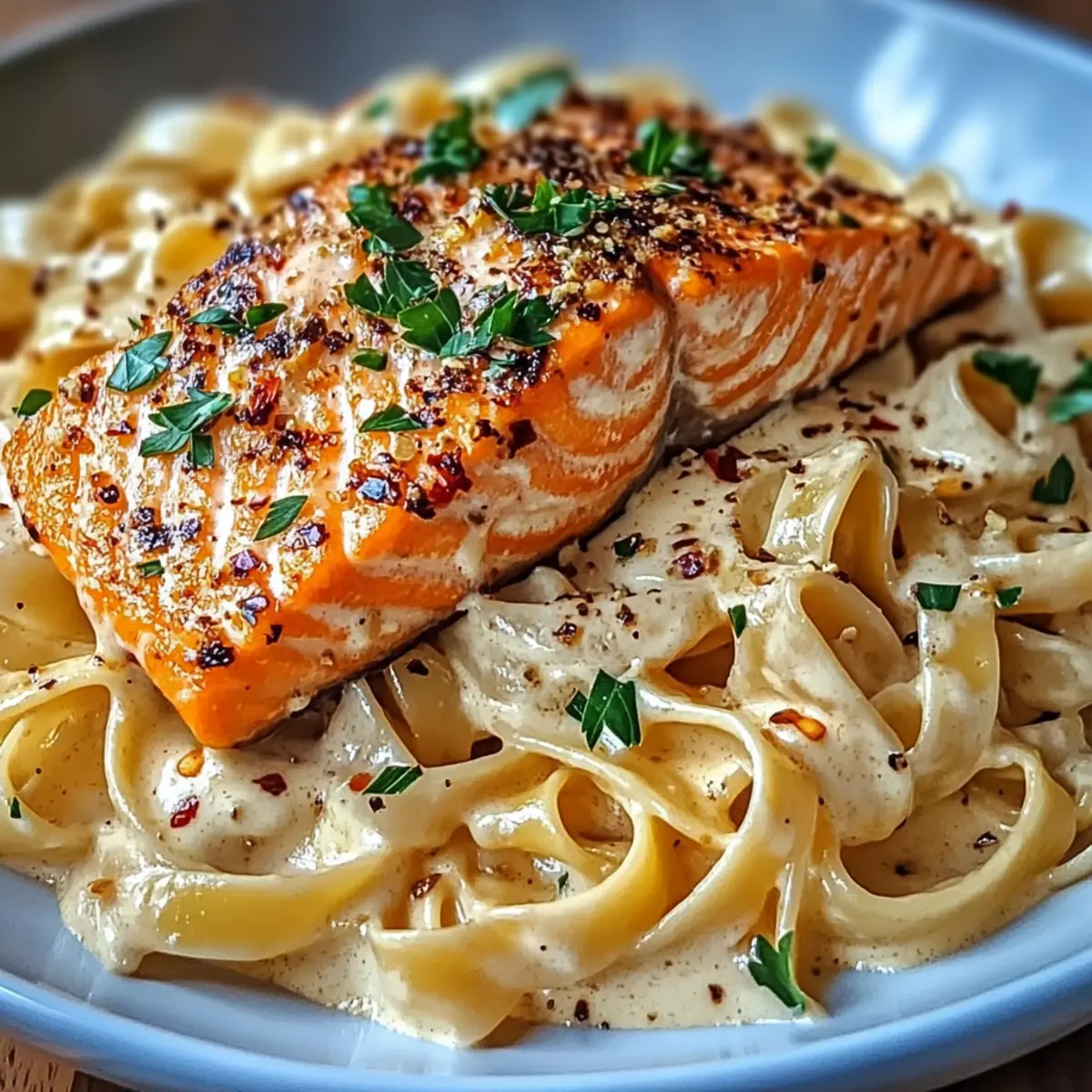 Plate the fettuccine, placing a seared salmon fillet on top of each serving. Garnish with freshly chopped parsley, a sprinkle of extra Parmesan, and a pinch of red pepper flakes for added flair. Enjoy the heavenly combination of flavors and the comforting texture that makes this dish a standout favorite!