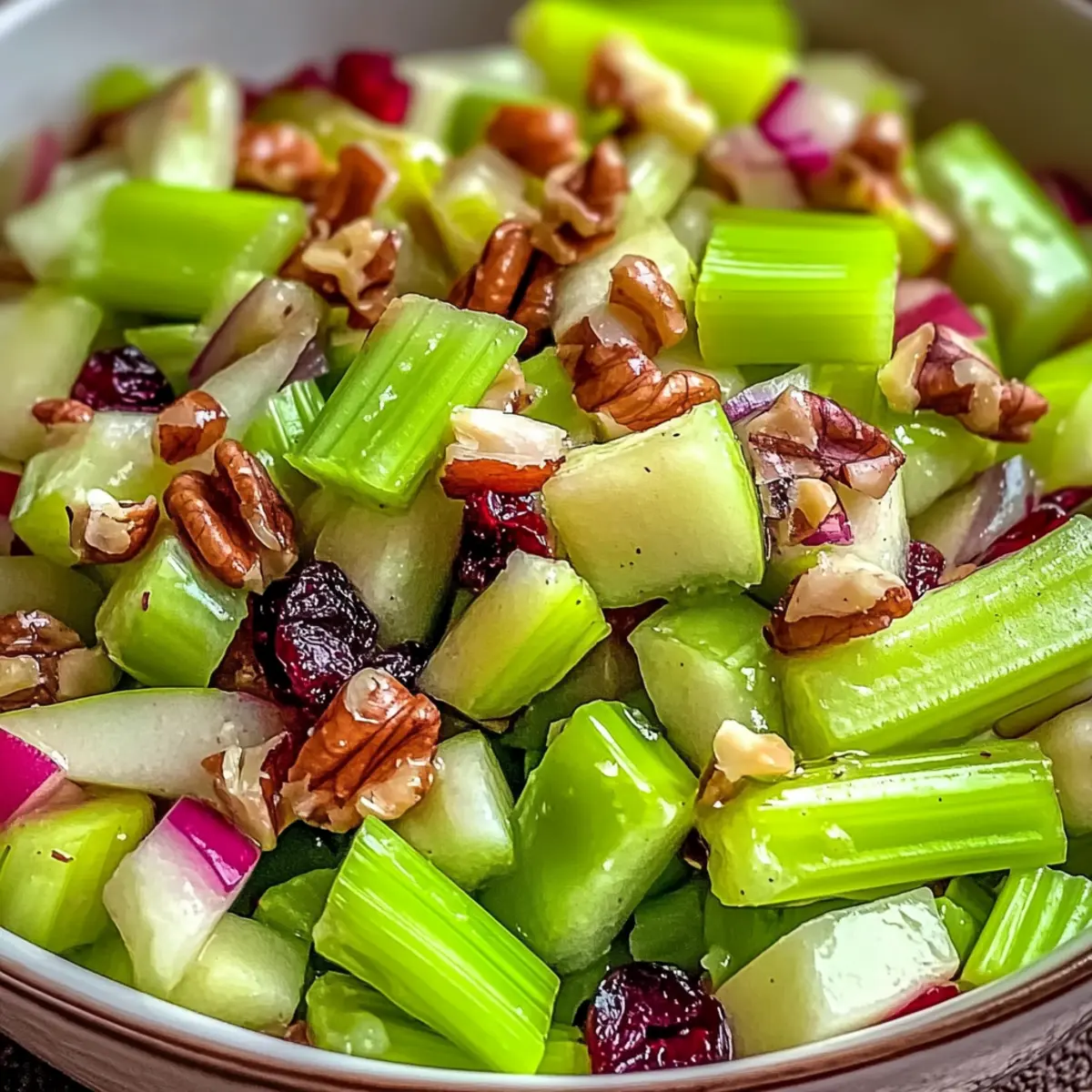 - In a large mixing bowl, combine celery, apple, walnuts, cranberries, and red onion, and mix gently.