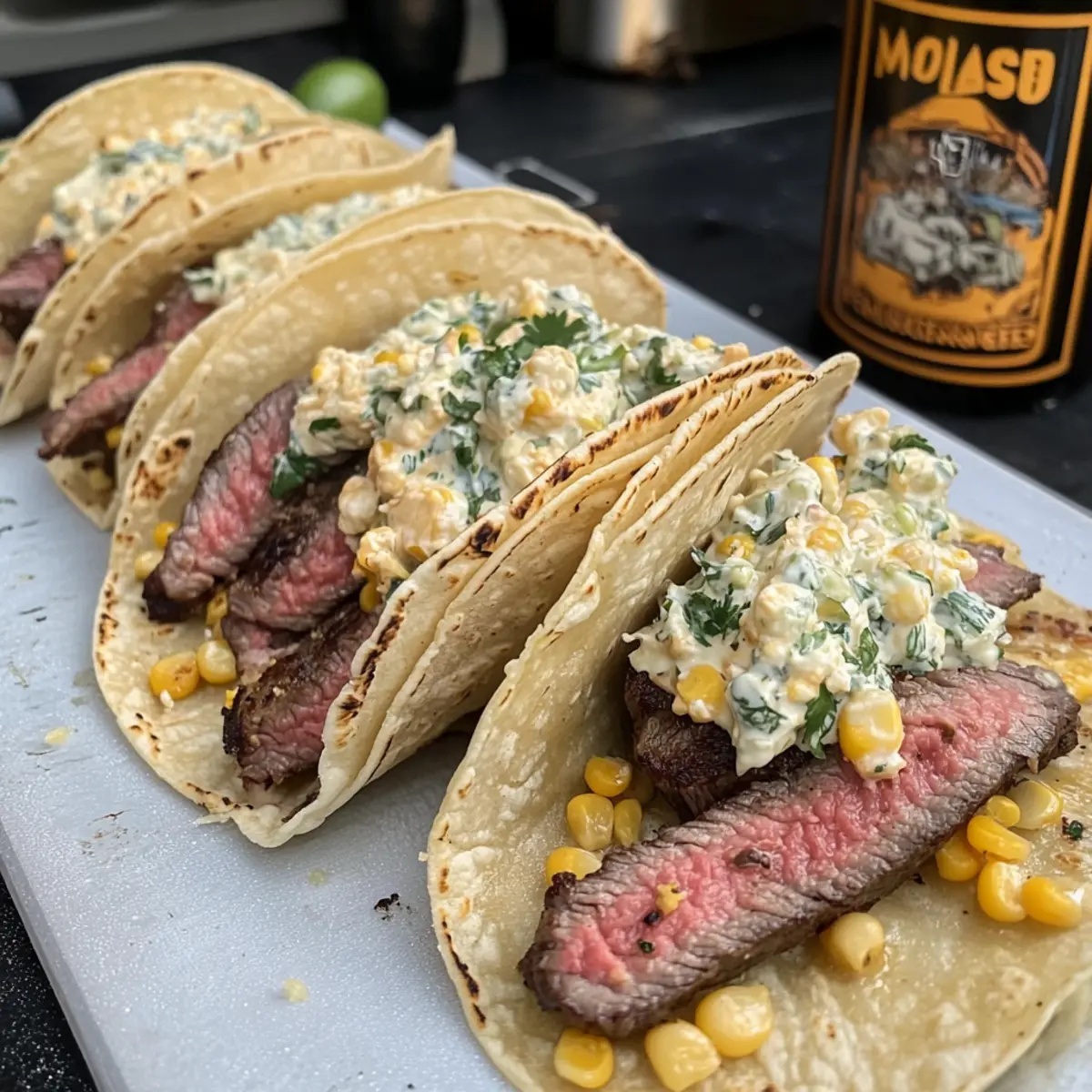 - Assemble the tacos with sliced ribeye and elote mixture on warm tortillas.