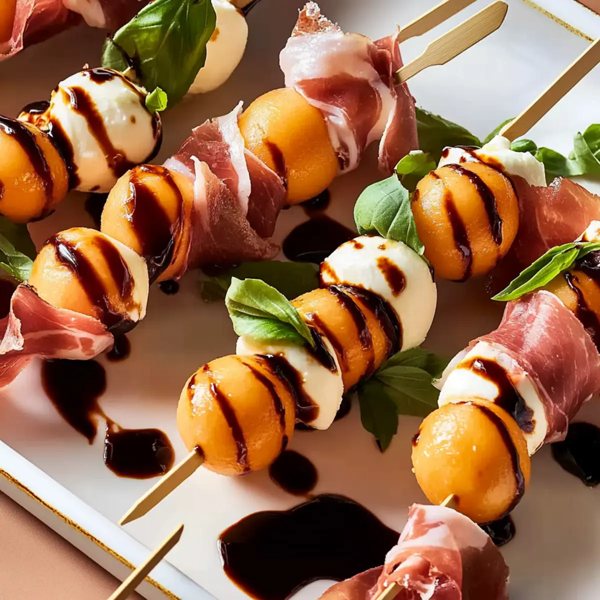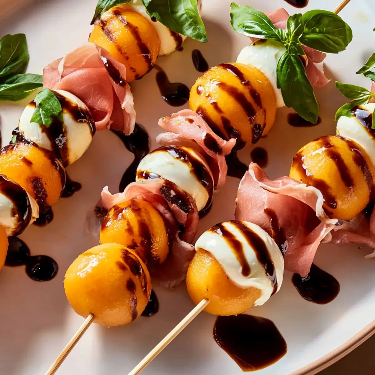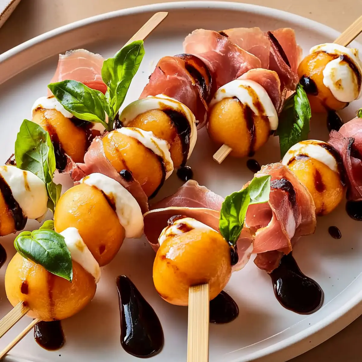 - Assemble the Skewers: Layer a cantaloupe ball, mozzarella ball, slice of prosciutto, and a basil leaf. Repeat the pattern until the skewer is filled.