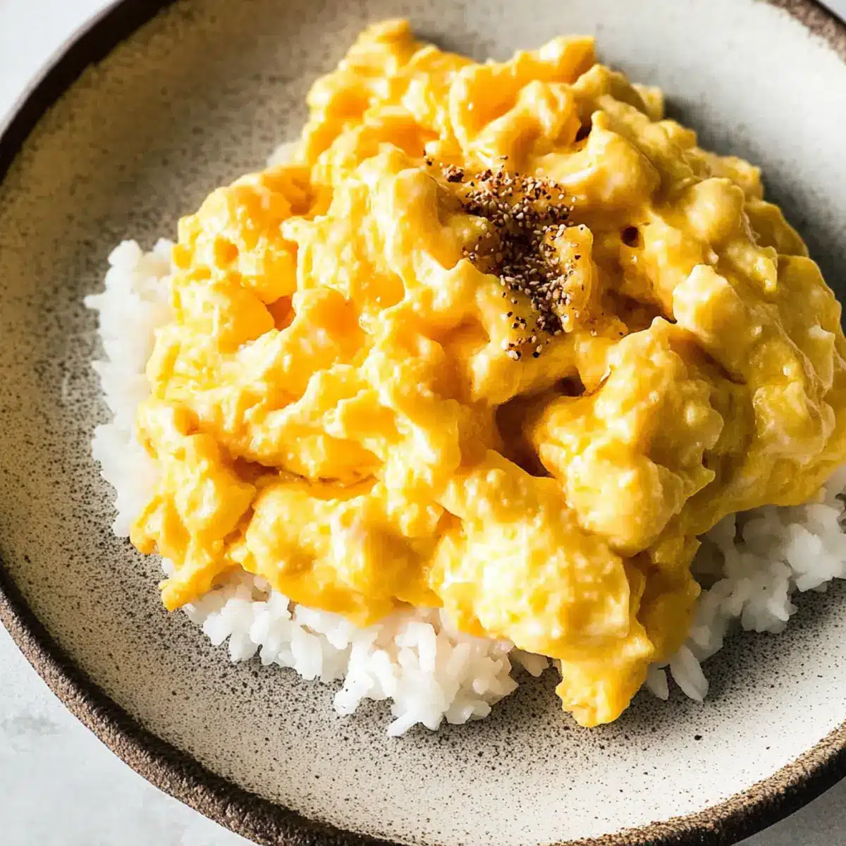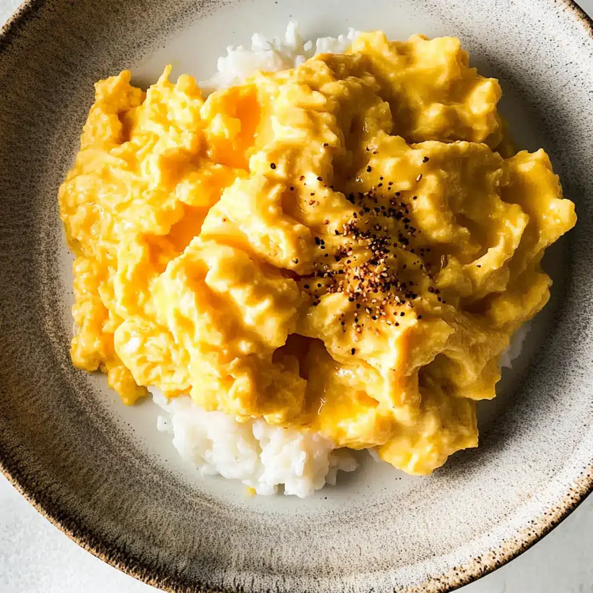 - Once the eggs are fluffy yet slightly runny, remove from heat and serve immediately, optionally garnished with shichimi togarashi.