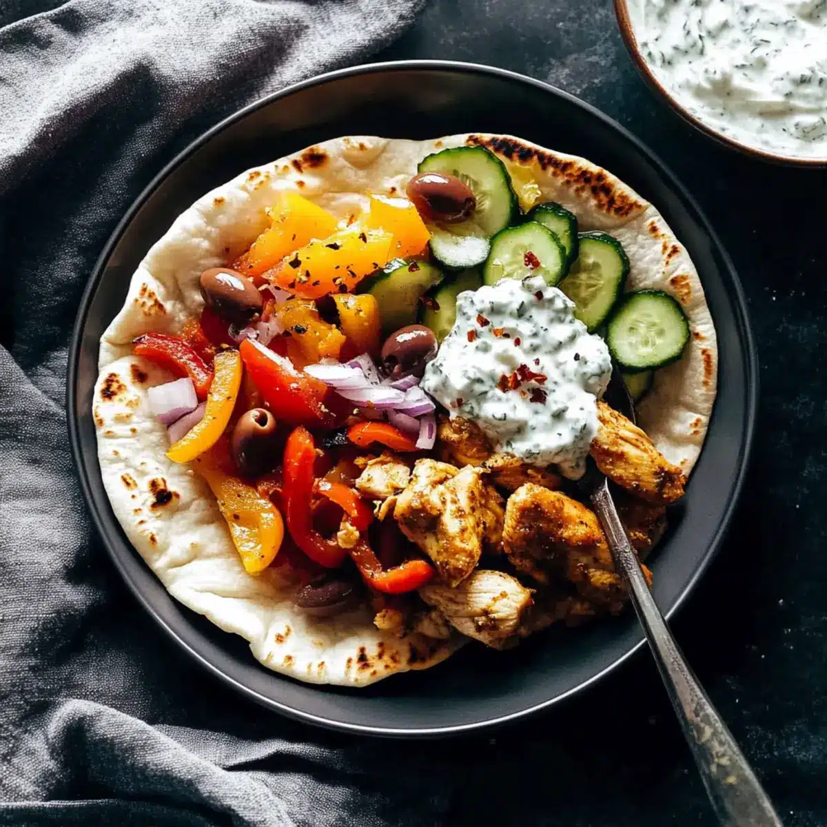 - Once cooked, assemble by filling warm pita bread with chicken, roasted peppers, and tzatziki. Add garnishes as desired.