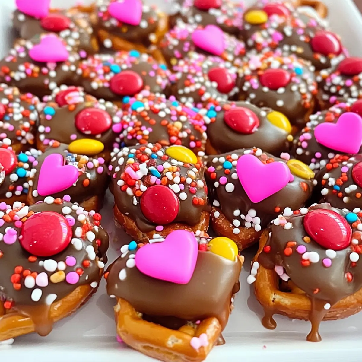 After baking, work swiftly to press an M&M onto each melted Rolo. This is where the fun begins! While the caramel is still warm, sprinkle some festive Valentine’s sprinkles on top of the M&M’s. The heat will help the candies adhere perfectly, creating a gorgeous array of color for your Valentine’s Day Caramel Pretzel Bites.