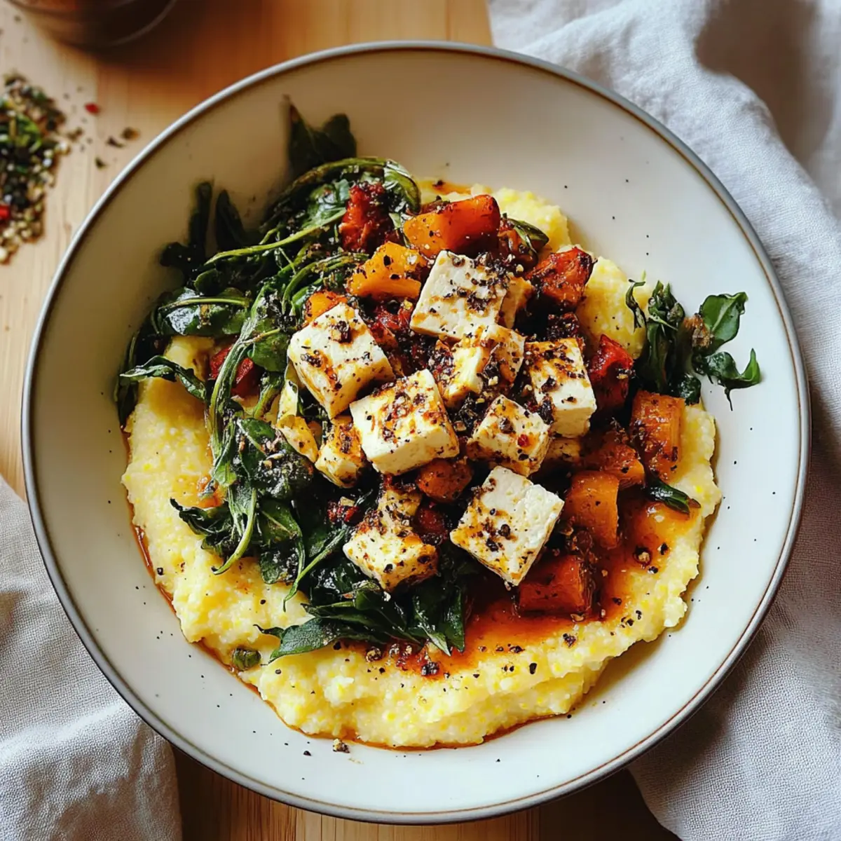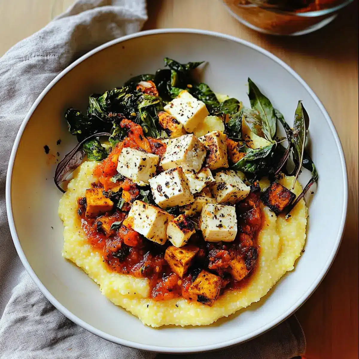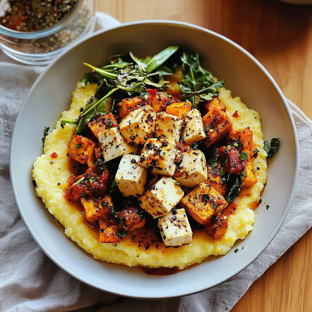 Creamy Comfort: The combination of velvety polenta and spicy tofu makes for a dish that hugs your taste buds.